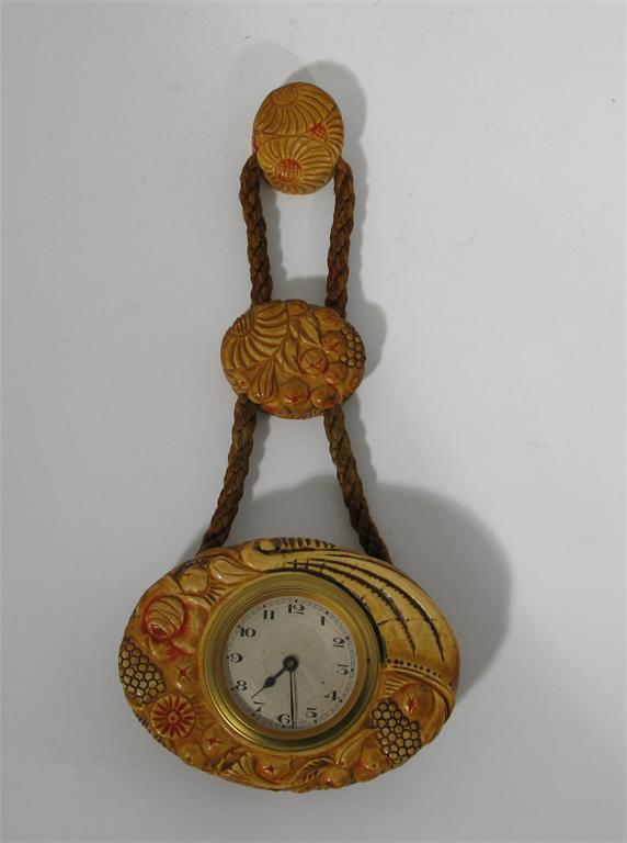 A Ebena plastic hanging wall clock cast with stylised flowers, highlighted in colours, with silk rope hanging, with swiss movement unsigned overall height 23cm.