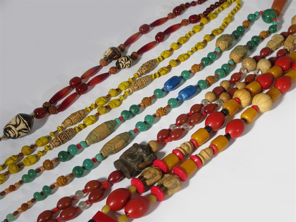 Five long Ebena plastic necklaces each with Oriental Galalith beads unsigned