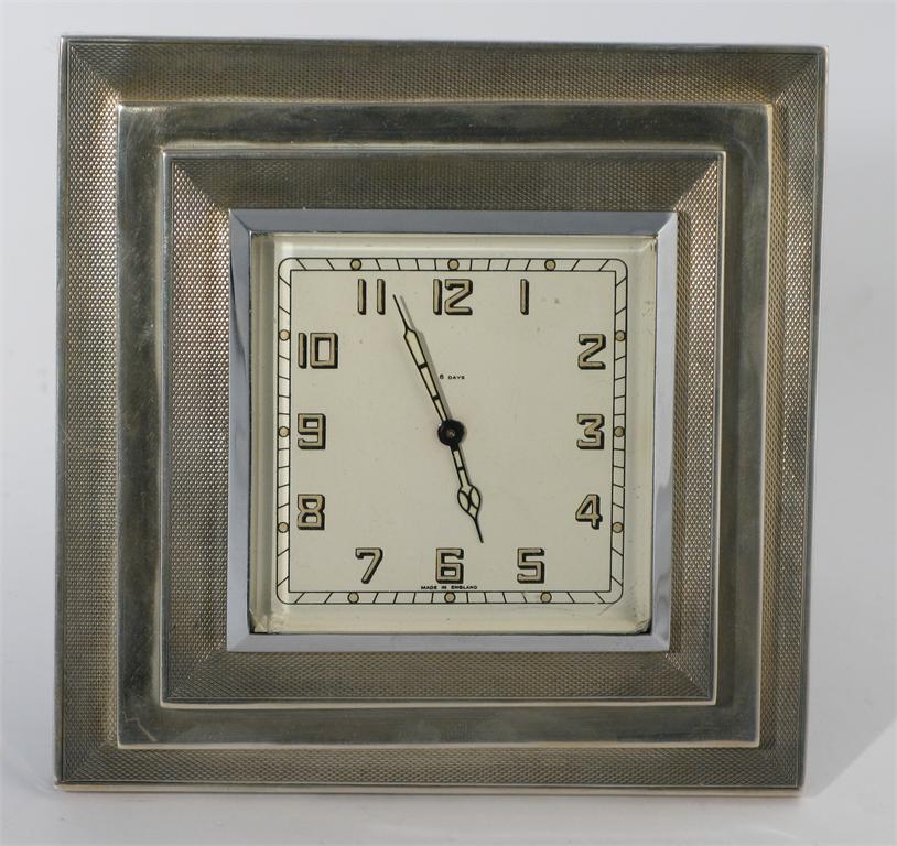 A Smiths silver mantel clock stepped square section, with engine turned bands, stamped marks Birmingham 1935 13cm. square