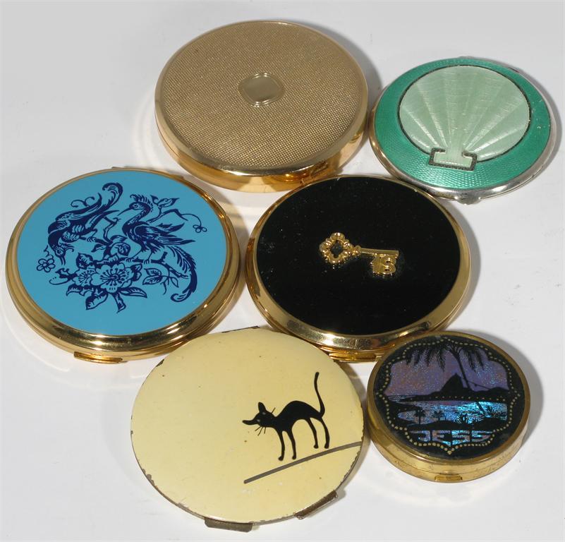 Six various compacts including an enamelled black cat, an enamelled bird of paradise and an engine turned example, largest 7.5cm. diam.