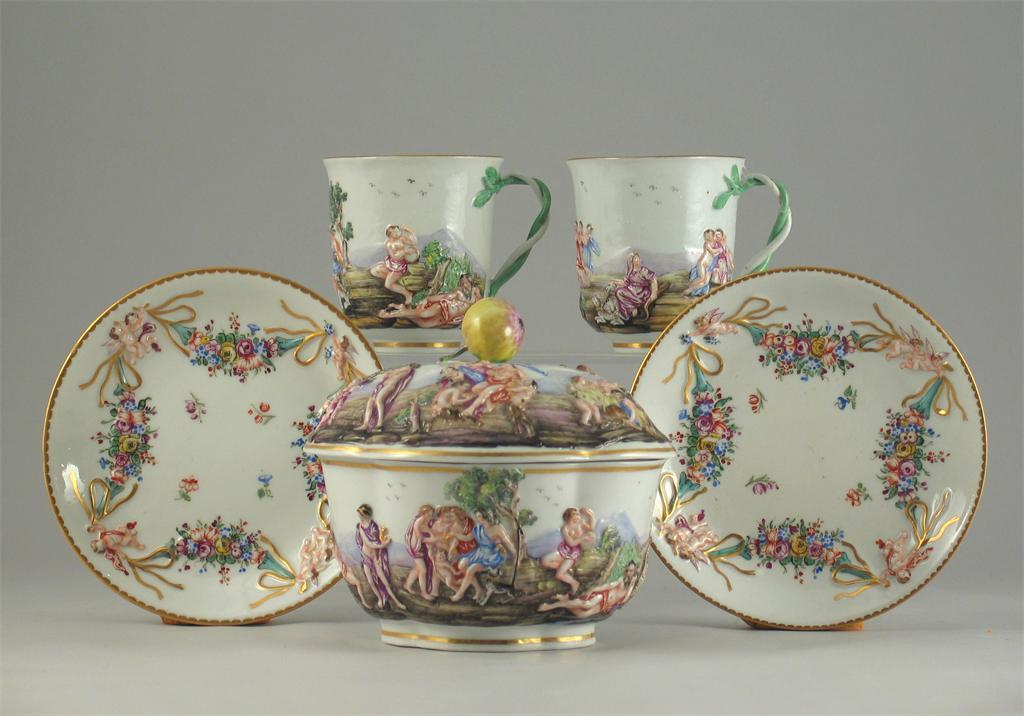 A pair of Italian relief moulded cups and saucers, and a similar quatrelobed bowl and cover, moulded with figures and flowers, impressed marks. Some damage. 19th century. (6)