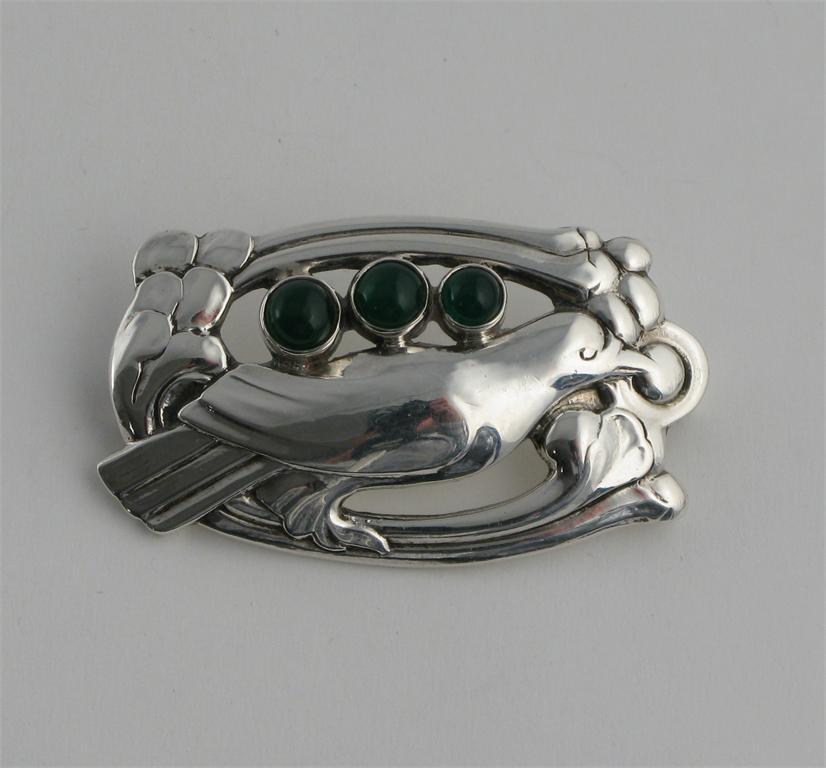 A Georg Jensen silver and enamel brooch model no.187, cast in low relief with a bird amongst foliage stamped marks 4cm. wide