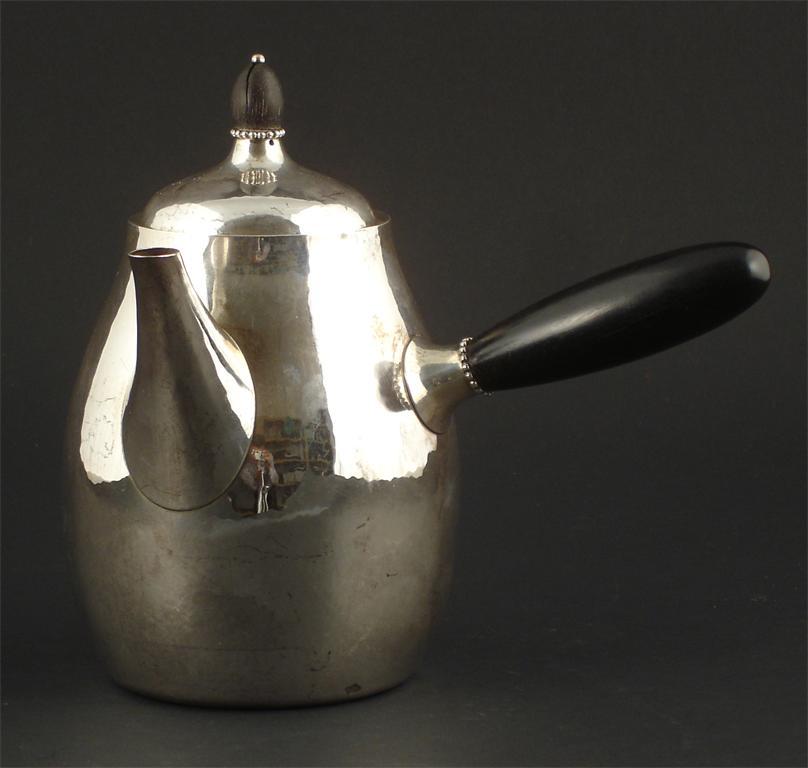 A Georg Jensen silver coffee pot and cover with ebonised wood handle and finial stamped marks