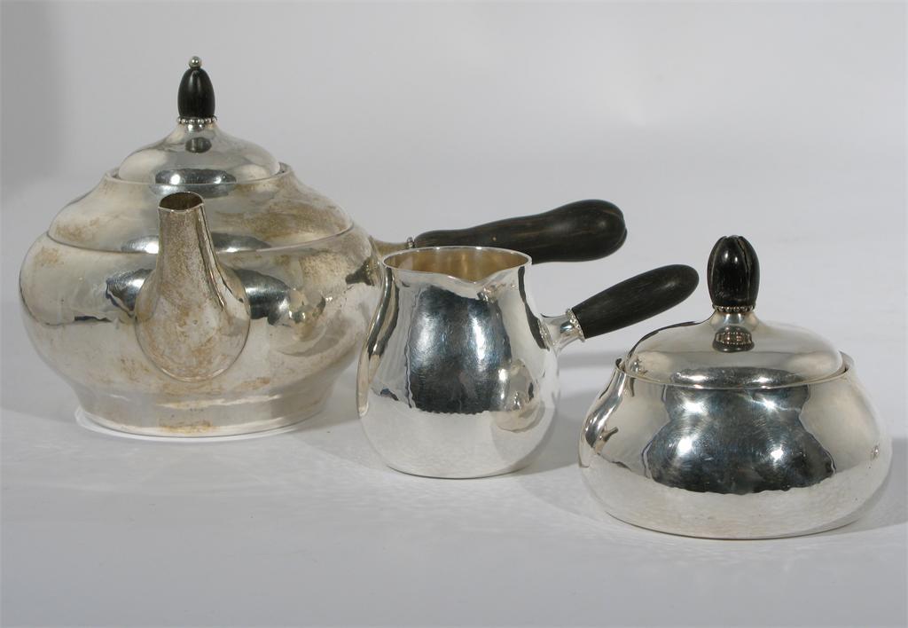 A Georg Jensen silver and ebonised wood three piece tea set comprising teapot and cover
