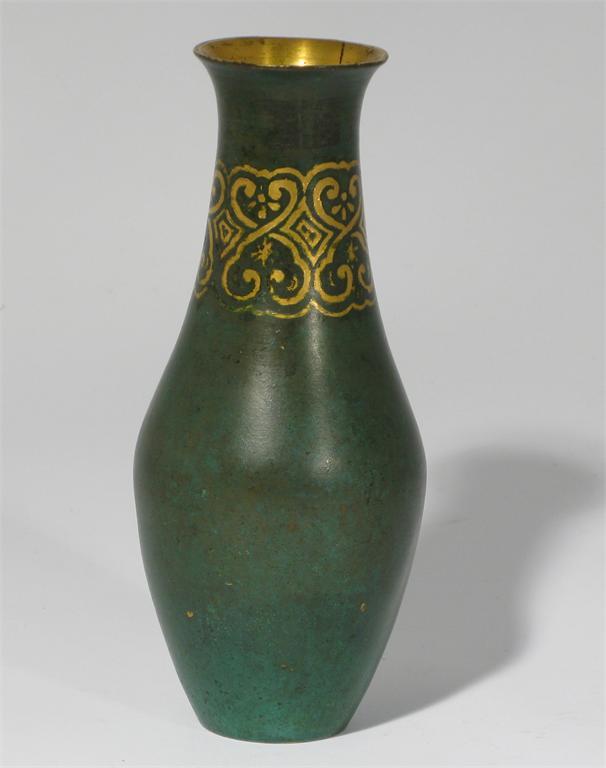 A Christofle verdi gris bronze vase model no.8C, the neck decorated in gilt with geometric frieze cast marks 17cm. high