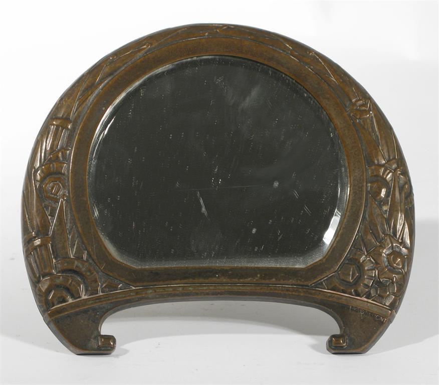 A patinated bronze table mirror cast from a model by J A Briquemont, on easel support cast signature 17cm. wide