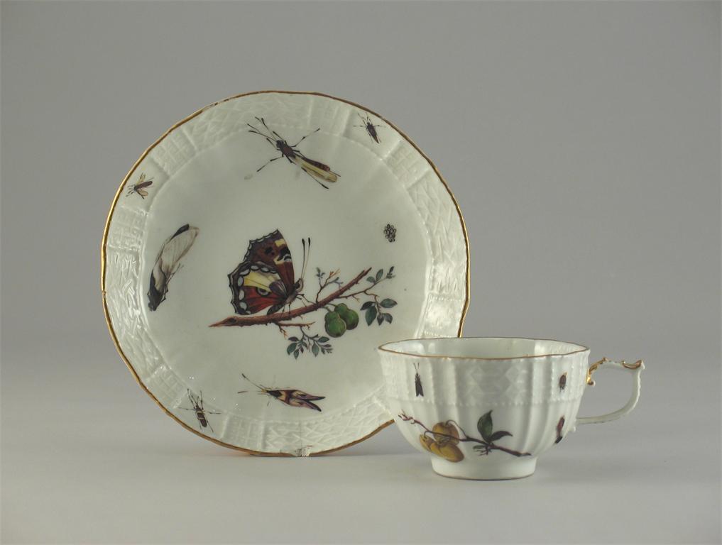 A Meissen teacup and saucer, moulded and brightly painted with bugs and fruiting branches. The saucer cracked. 18th century. (2)