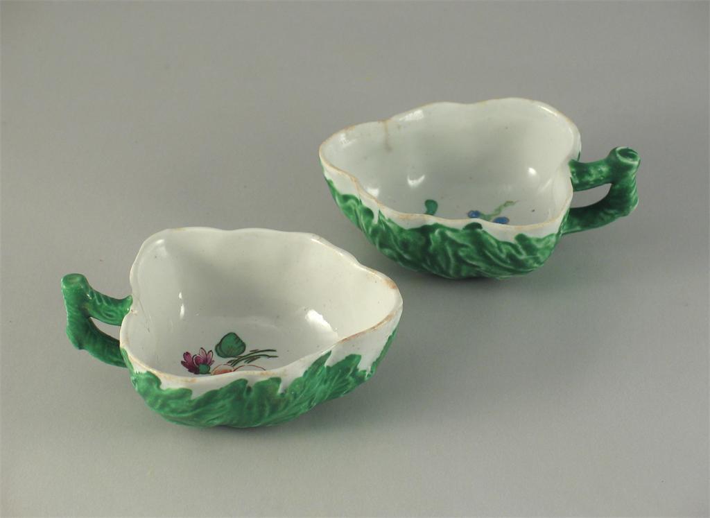 A pair of Doccia leaf shaped dishes, the exteriors moulded as green leaves, the interiors painted with flowers. Both with damage. Late 18th century, 9.7cm. (2)