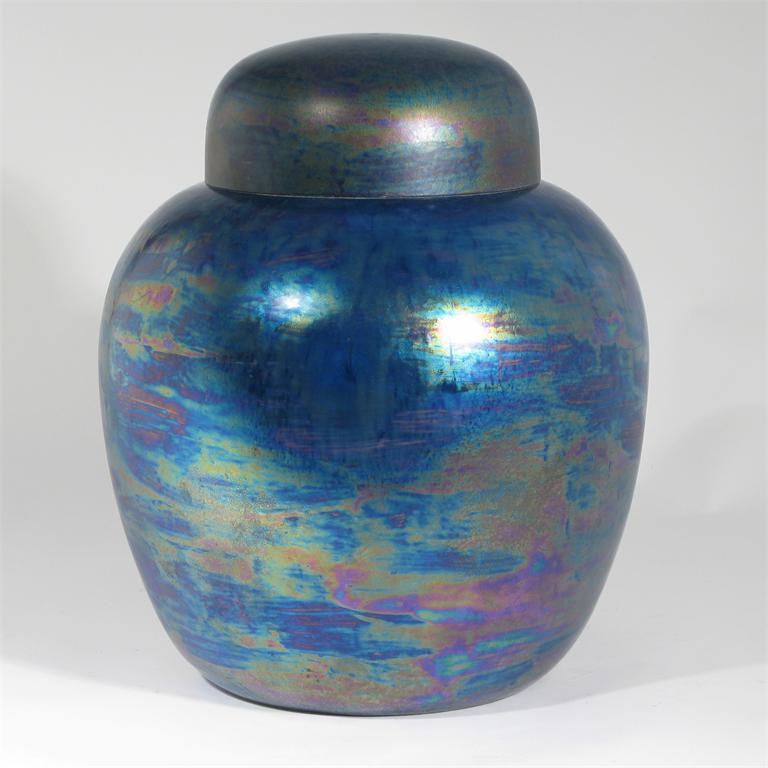 A large Ruskin Pottery Kingfisher lustre jar and cover covered in an iridescent blue glaze...