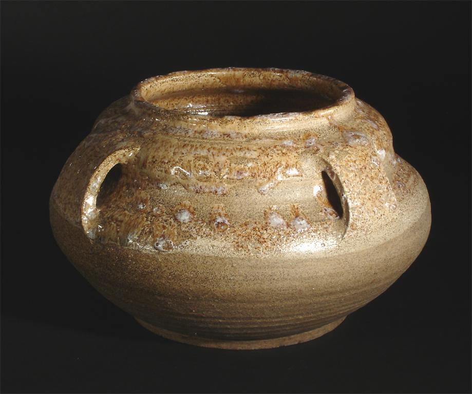An interesting Poole stoneware vase shouldered form with three applied lug handles covered in a...