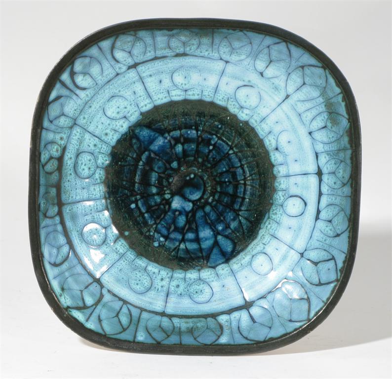 An early Troika Pottery 'D' plate painted with radiating leaf design in shades of blue on a...