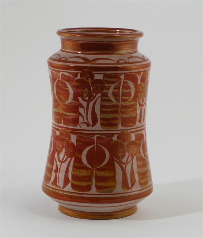 An Alan Caiger-Smith Aldermaston Pottery vase waisted cylindrical form painted with panels in...