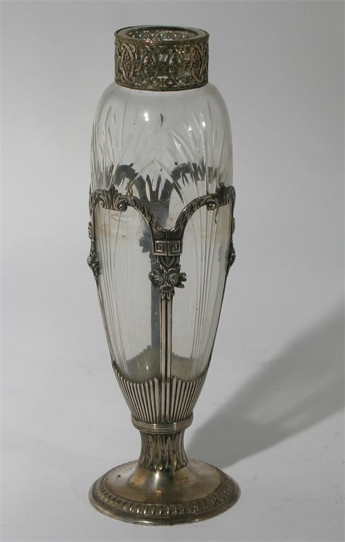 An Orivit pewter mounted glass vase model no.3679, cast in low relief with floral panels, stamped AOG marks 27cm. high