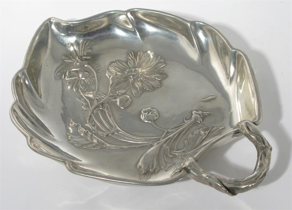 A Kaysezinn pewter leaf dish cast in low relief with flower sprays stamped to front 25.5cm. wide