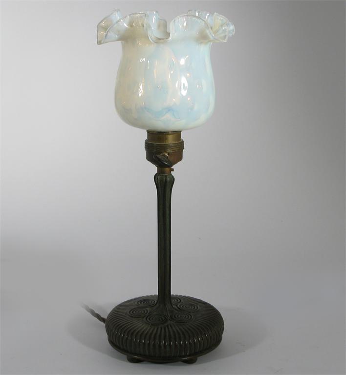 A Tiffany Studios patinated bronze lamp base model no.28605, with a later vaseline glass shade stamped marks to base 33.5cm. high