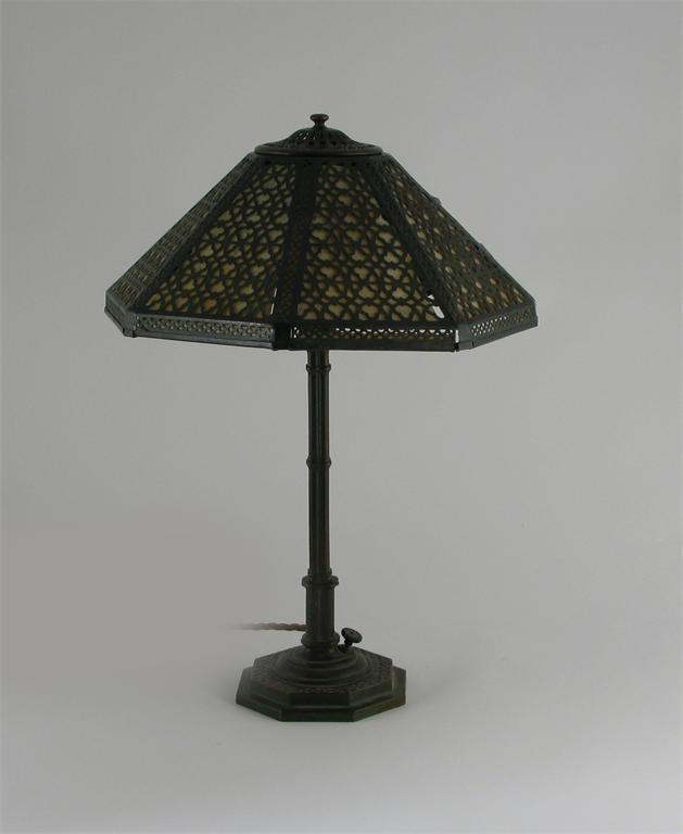 A Tiffany Studios verdi gris patinated bronze lamp base model no.555, with patinated metal and glass octagonal shade stamped marks to base 47cm. high