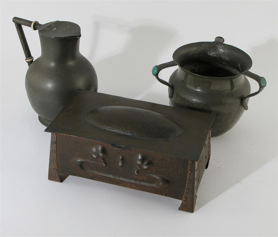 A patinated copper, cedar lined cigarette box stamped in low relief with stylised foliate design, and two other pewter items stamped marks 21.5cm. wide