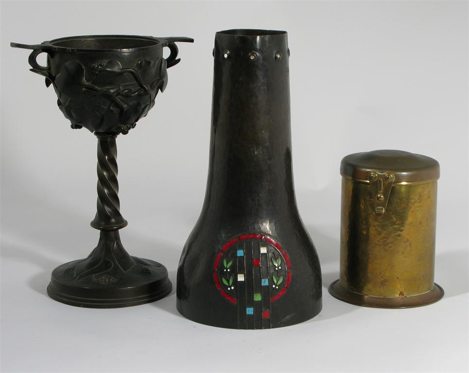A Continental patinated copper vase decorated with a secessionist floral panel, enamelled in colours, a patinated metal twin-handled coupe and a brass jar and cover main impressed mark 26cm. high