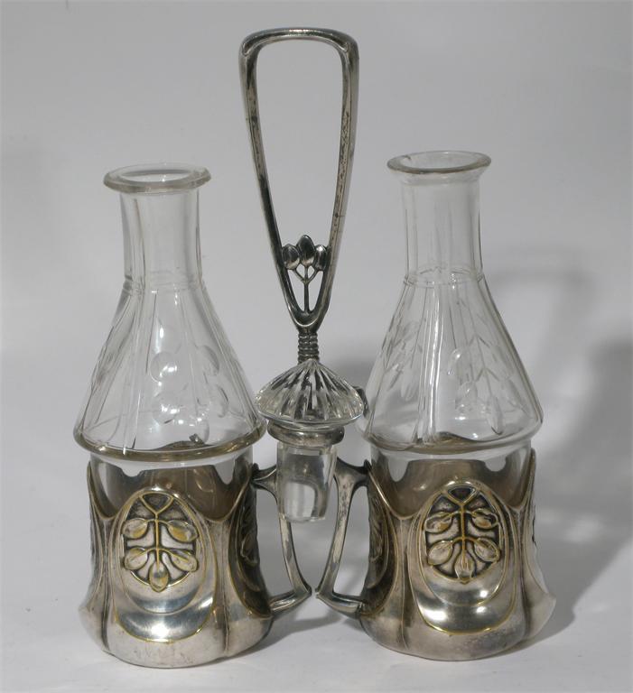 A Orivit pewter and glass cruet set model no.8237, stamped in low relief with leaf sprays, the bottles cut with similar leaf sprays stamped marks, one stopper missing, minor nicks to one bottle 22cm. high