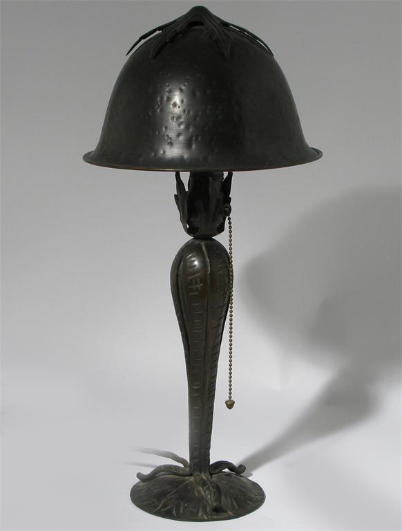 A patinated metal table lamp probably American, domed shade with simulated hammered finish unsigned 49cm. high