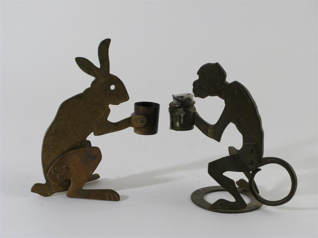 A pair of brass novelty candlesticks modelled as a rabbit and a monkey