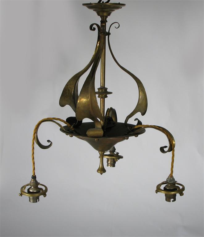 An Arts and Crafts patinated brass hall lantern scrolling form, with three hanging fittings unsigned 40cm. high