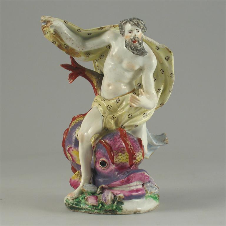 A Bow model of Neptune, riding a colourful dolphin. Old restoration and wear. c.1760, 15cm.