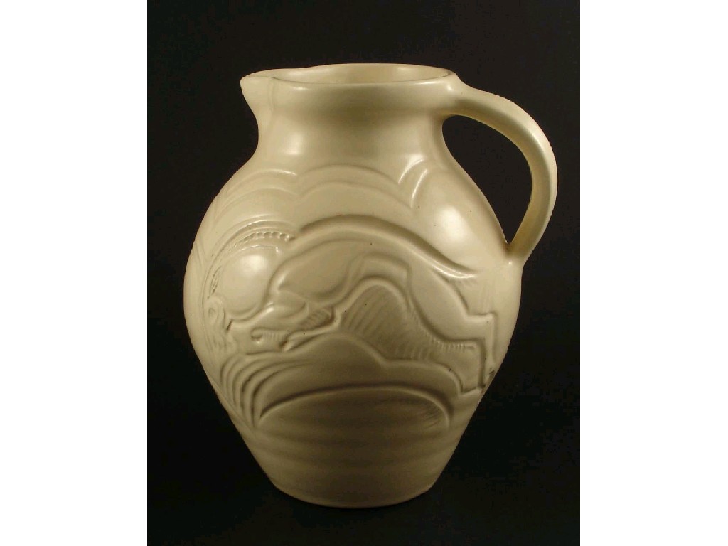 A Susie Cooper carved jug incised with a leaping ibex incised Susie Cooper England 22cm. high