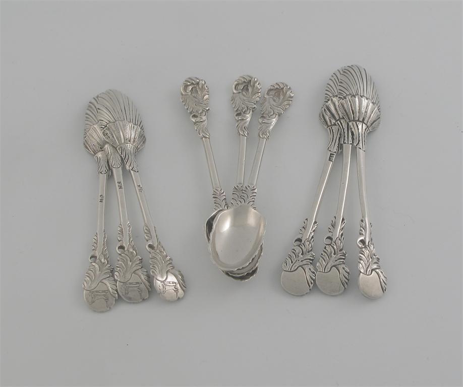 A set of six George II teaspoons, with shell bowls, scrolling leaf terminals, crested, by Francis Harrache, London, and three George II teaspoons of similar design, two unmarked, the other maker's mark 'IH', 4.2oz. (9)