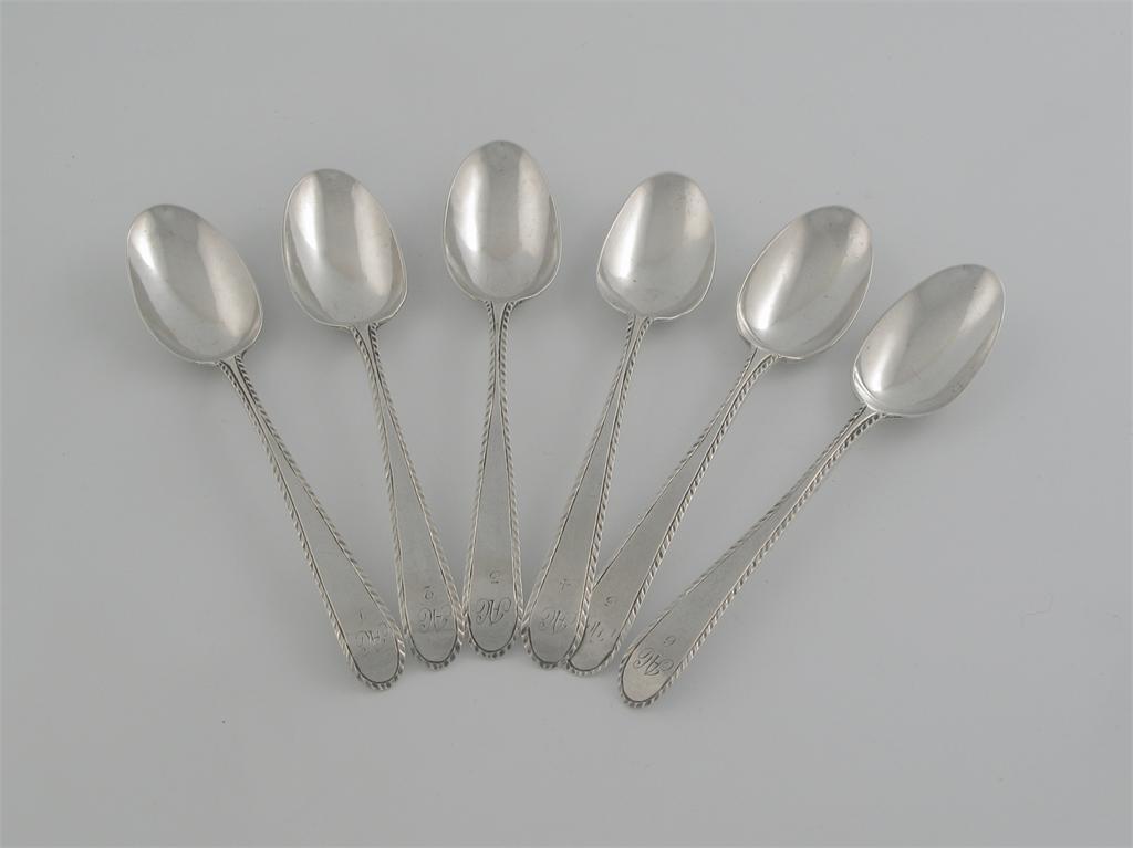 A set of six George III feather edge teaspoons, initialled AC and numbered 1-6, by Charles Hougham, c.1780, 2.25oz. (6)