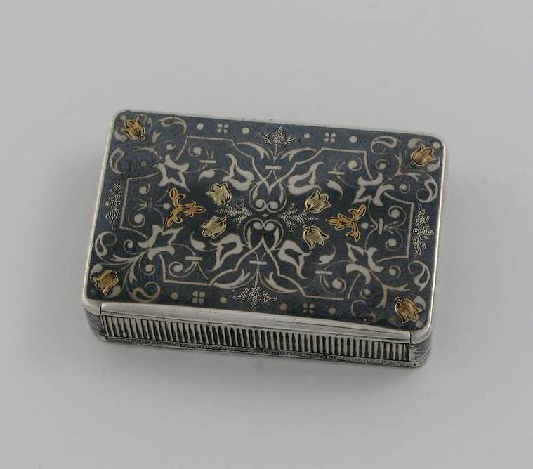 An interesting late 19th century Viennese niellowork vesta case, with a 'patent' closure and sprung cover, with two colour gilded highlights, the inside cover inscribed 'Grand Duke Michael of Russia form Spencer Eddy 1894', maker's mark 'LV' c.1894, 1.9in (4.9cm) long, 1oz. *Grand Duke Mikhail of Russia, born 1878 St. Petersburg and assassinated 1918 in perm.  In 1894 on the death of his father Tsar Alexander III, Mikhail's brother became Tsar Nicholas II.  In 1917 Tsar Nicholas II abdicated, March 15th 'bequeathing our inheritance to our brother the Grand Duke Mikhail, who for only a few hours, was the last Tsar of Russia before it was declared a Republic. Spencer Fayette Eddy, American diplomat, born Illinois 1874, died 1939. He was Secretary of the American Embassy in St. Petersburg in 1894, and narrowly escaped with his life to Berlin during the time of the 1905 Revolution when he was nearly ridden down by cavalry when he got in between half a squadron of Cossacks charging the crowd and the crowd itself.