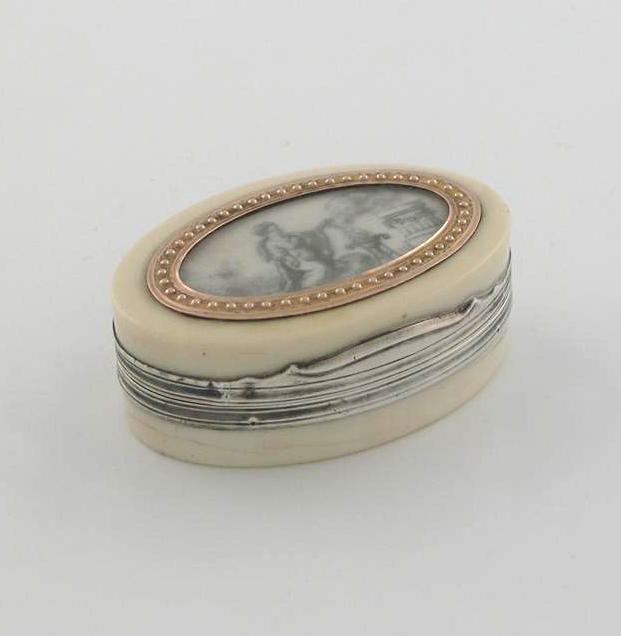 A late 18th century gold and silver mounted ivory patch and make up powder box, oval, the hinged cover inset with a painting en grisaille behind glass and opening to reveal two hinged, powder compartments, unmarked c.1785, probably French, 2.2in (5.5cm) long.