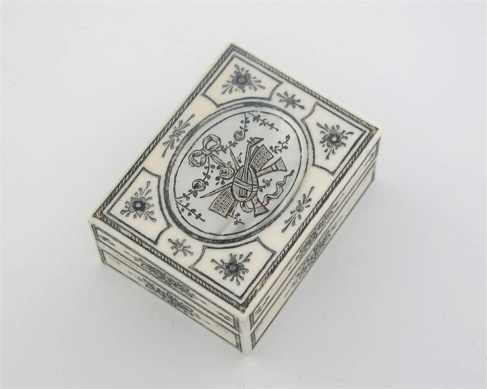 An oblong ivory make-up box, with 'foiled' decoration and a mother of pearl panel on the cover, decorated with musical trophies, the interior with two covered compartments and an inset mirror, probably late 19th/early 20th century French, 2.5in (6.3cm) long.