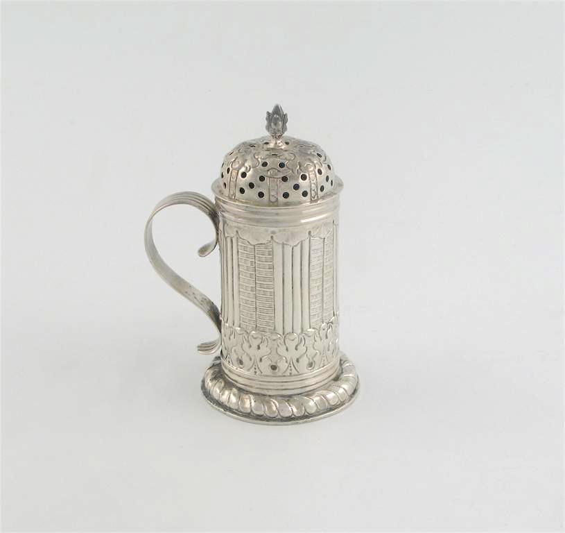 An 18th century Dutch, kitchen dredger, on a domed foot with embossed decoration, a domed cover and a bud finial, unascribed, probably early 18th century, 4.75in (12cm) high, 3.5oz.