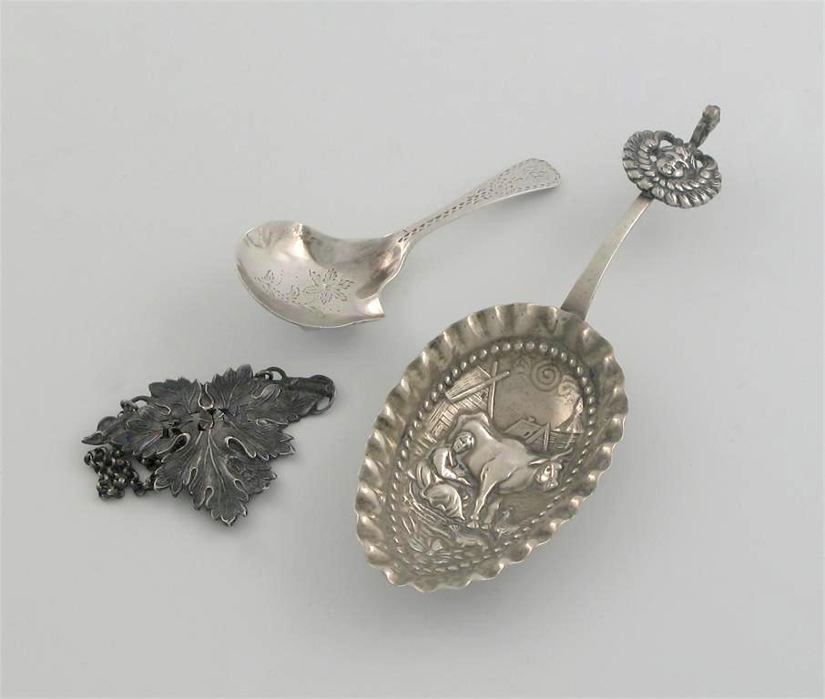 A George III caddy spoon, with shovel bowl, engraved decoration, by George Smith III & William Fearn, London 1788, a Victorian vine leaf wine label, pierced 'RUM' by George Unite, Birmingham 1849, and a Dutch embossed caddy spoon. (3)