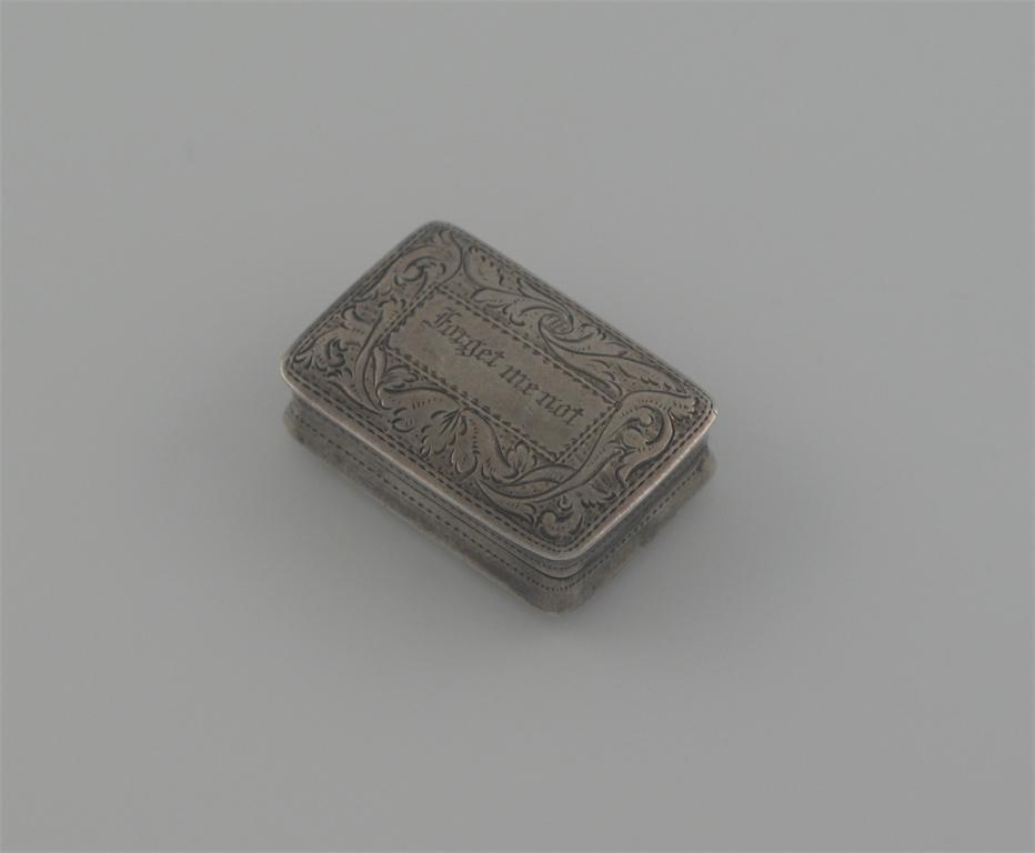 A William IV oblong vinaigrette, engraved decoration and inscribed 'Forget Me Not', pierced grill, by Nathaniel Mills, Birmingham 1830, 1.25in (3.2cm) long.