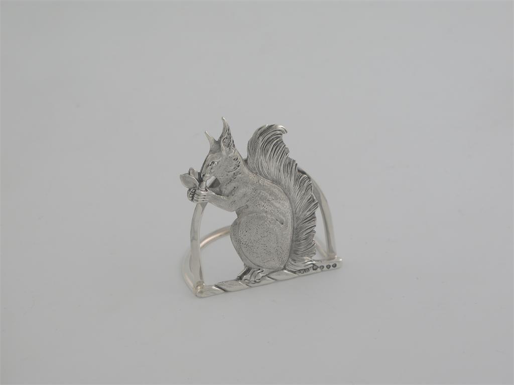 A Victorian heraldic menu holder, in the form of a squirrel eating a nut, curved base, by H. W. Dee, London 1877, 2in (5cm) high, 1oz.