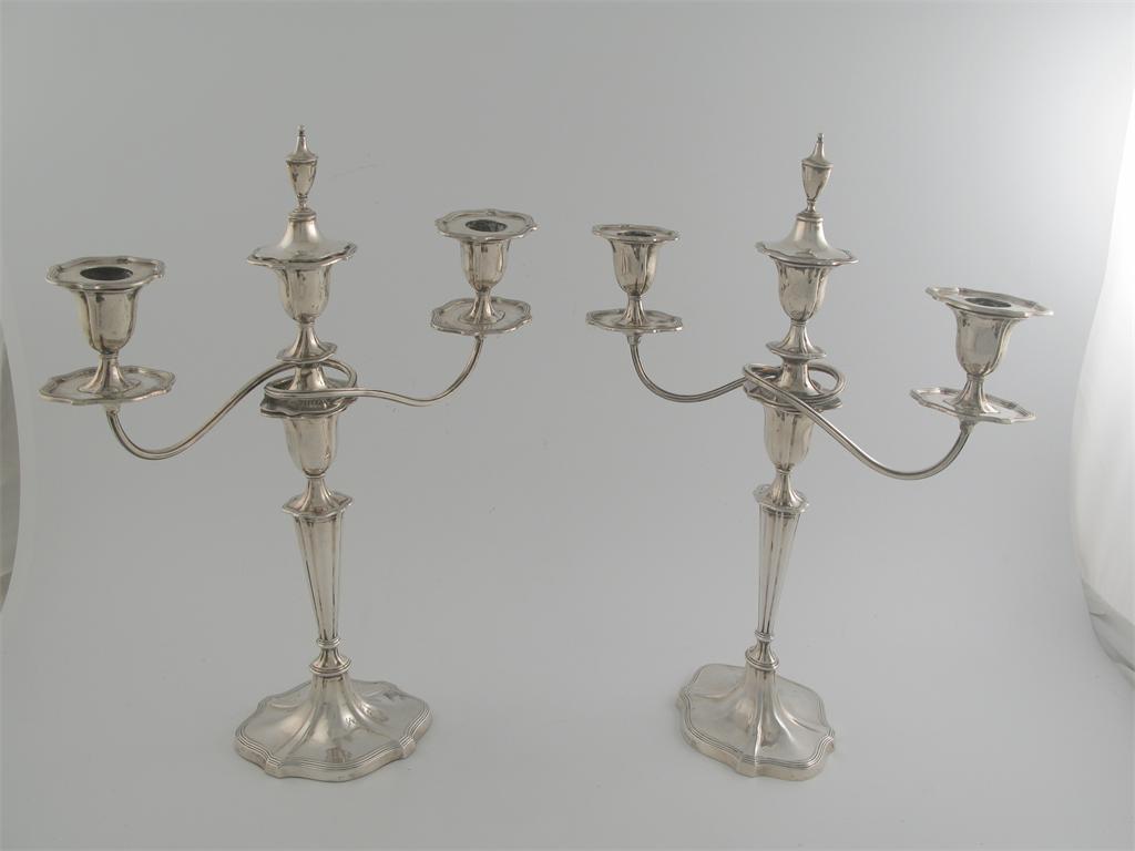A pair of Edwardian three light candelabra, on shaped oval bases with fluted tapering columns and reeded borders, the scroll branches with vase shaped capitals and urn finials, by Hawkesworth, Eyre & Co., Sheffield 1903 (columns loaded), 15.4in (39cm) high, weight of branches 32oz. (2)
