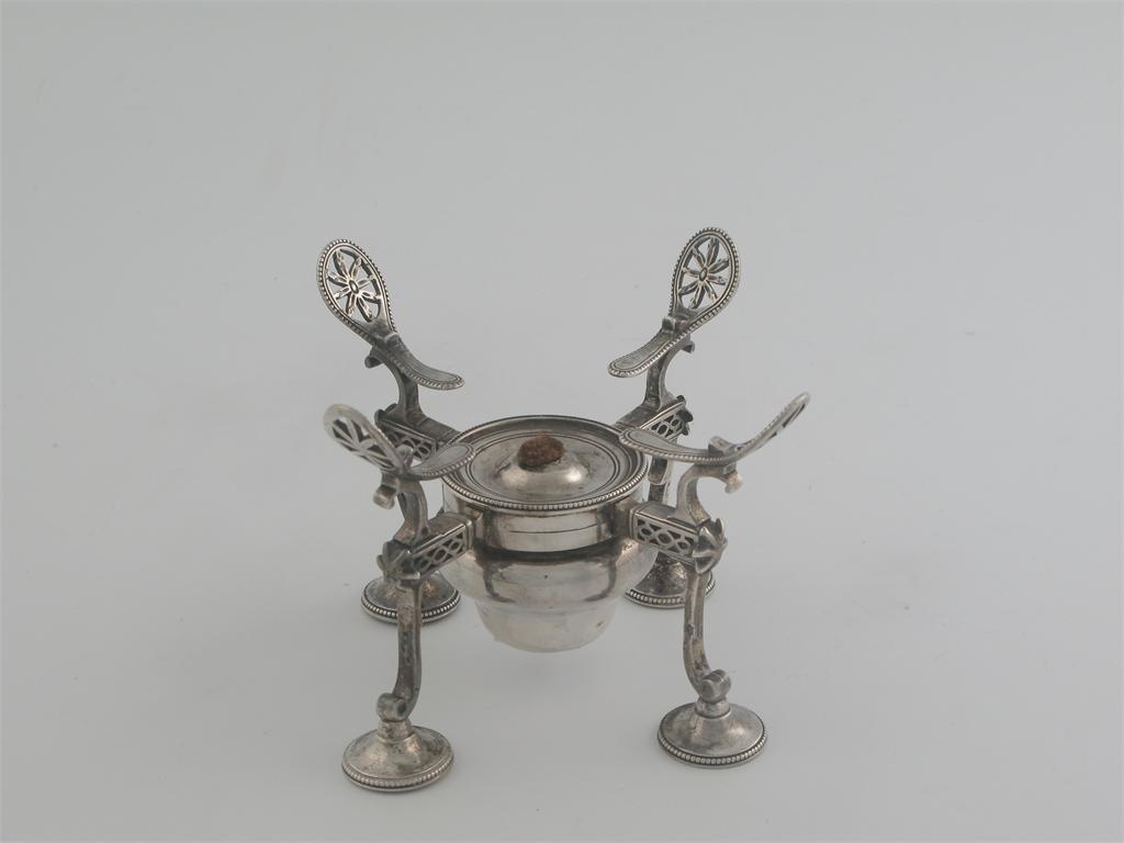 A George III dish cross, with bead borders, and pierced supports, central burner, by Robert Hennell, London 1787,(A/F), 5.5in (14cm) wide, 13oz.
