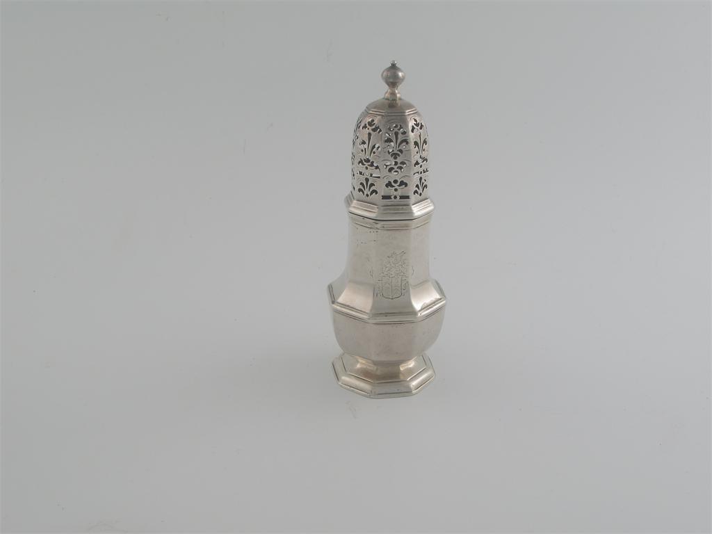 A Queen Anne baluster caster, octagonal form, with a high domed cover, ball finial, engraved coat of arms, by Thomas Bamford I, London 1725, 6.75in (17.2cm) high, 8oz.