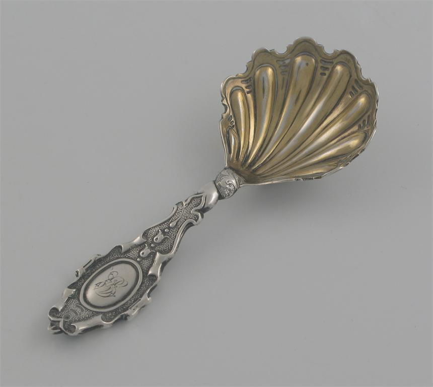 A Victorian caddy spoon, with shell gilt bowl, shaped scrolling stem, oval cartouche, monogrammed, by Francis Higgins, London 1855, 4.25in (10.5cm) long.