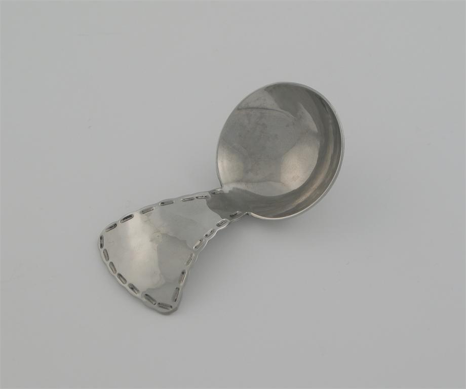 An arts and crafts chromium plated caddy spoon, by Keswick School of Industries and Art.