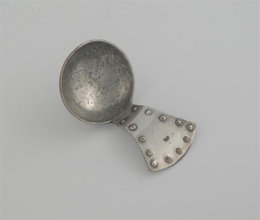 An arts and crafts plated copper caddy spoon, with hammered and beaded decoration, by the Keswick School of Industries and Art.