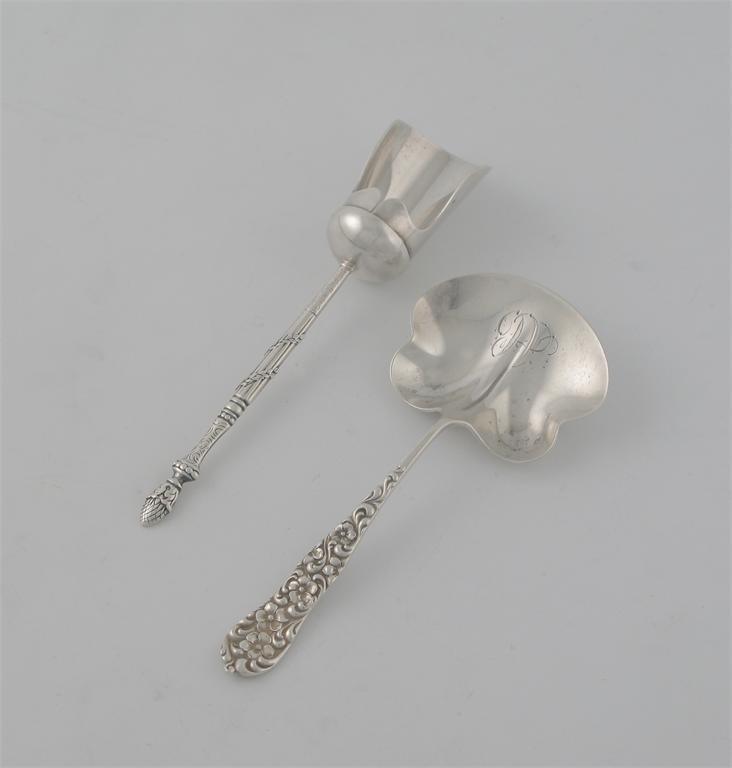 A modern American caddy shovel, with a waisted bowl, initialled AC, tapering stem with floral decoration, and a continental caddy scoop with a reeded and embossed stem and acorn finial.