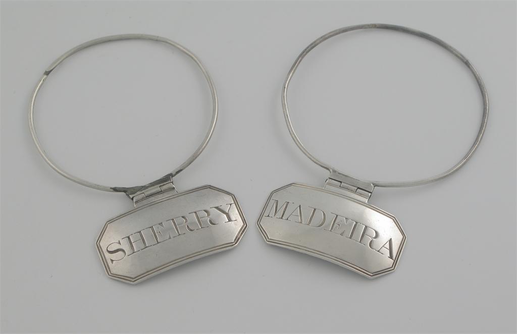 A pair of George III neck ring wine labels, with hinged labels of canted oblong form with thread borders, 'SHERRY' and 'MADEIRA', by T. Phipps and E. Robinson, London 1804. (2)