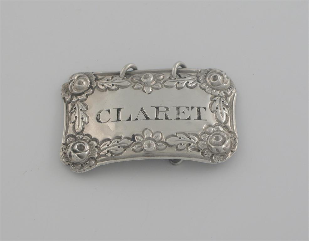 A George III/IV provincial wine label of waisted oblong outline with an embossed border of roses and other flowers, incised 'CLARET', by James Barber & William Whitwell, York 1820.