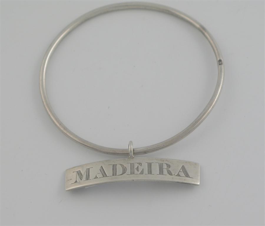 An early Victorian neck ring label, with a pendant oblong title, inscribed 'MADEIRA', by Sebastian Gespell (II), London 1839.