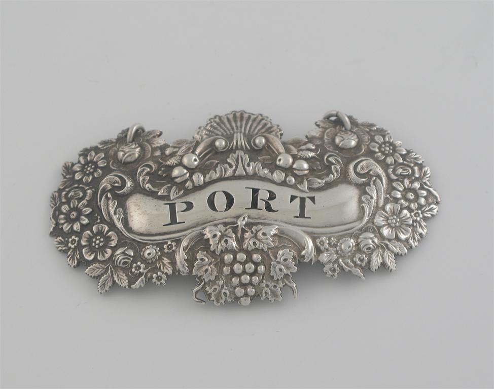 A George IV large floral wine label, with a shell surmount and a bunch of grapes below the title area, pierced 'PORT', by Charles Rawlings, London 1829.