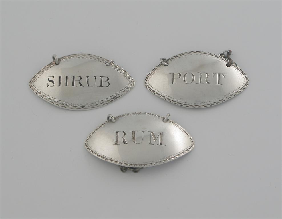 Three George III navette shaped wine labels, with bright cut borders: 'SHRUB', by Susanna Barker, London c.1785; 'PORT' by the same maker (maker's mark only) and another 'RUM', by William Kingdom or William Knight, London c.1795. (3)