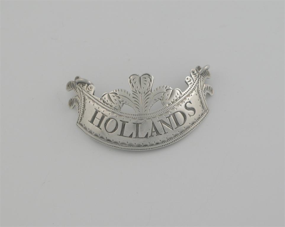 A George III bright-cut wine label, curved and surmounted by the Prince of Wales's feathers, incised 'HOLLANDS', by Peter & Ann Bateman, London 1792.